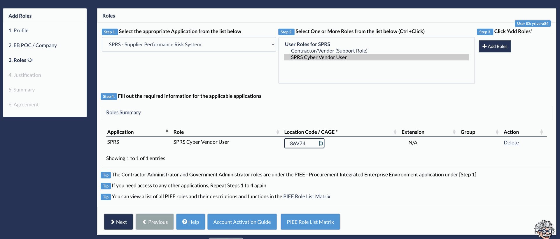 - Once approved, verify under My Account → Roles that you see Application: SPRS | Role: SPRS Cyber Vendor User | CAGE: [Your CAGE].